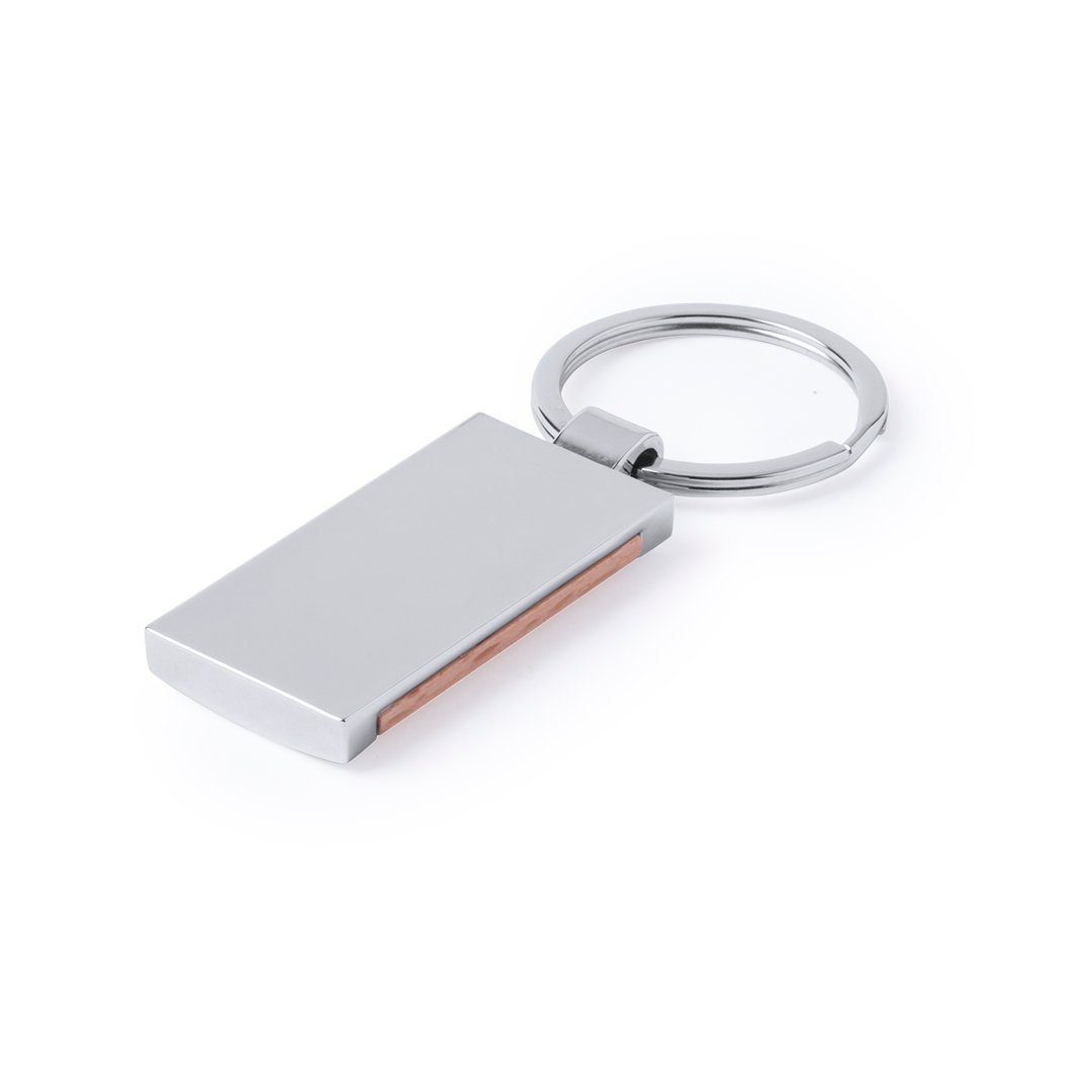 Llavero en combinación de materiales metal de acabado brillante y madera natural.