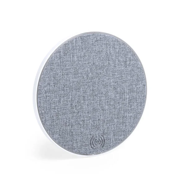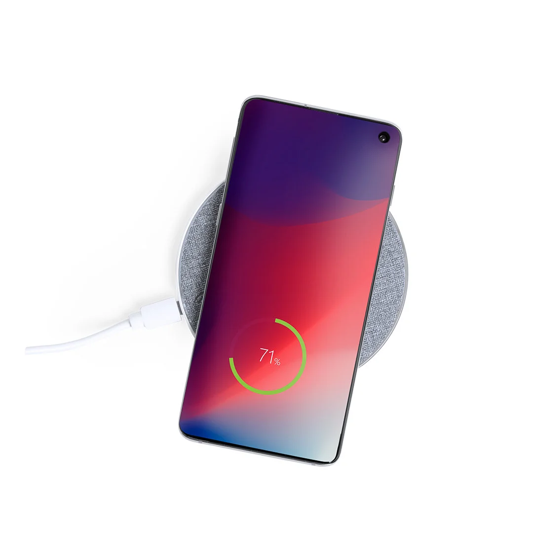 Cargador inalámbrico de diseño circular bicolor con base en poliéster. Con salida USB, cable de carga micro USB, base antideslizante y compatible con dispositivos equipados con tecnología de carga inalámbrica. Presentado en atractiva caja de diseño.