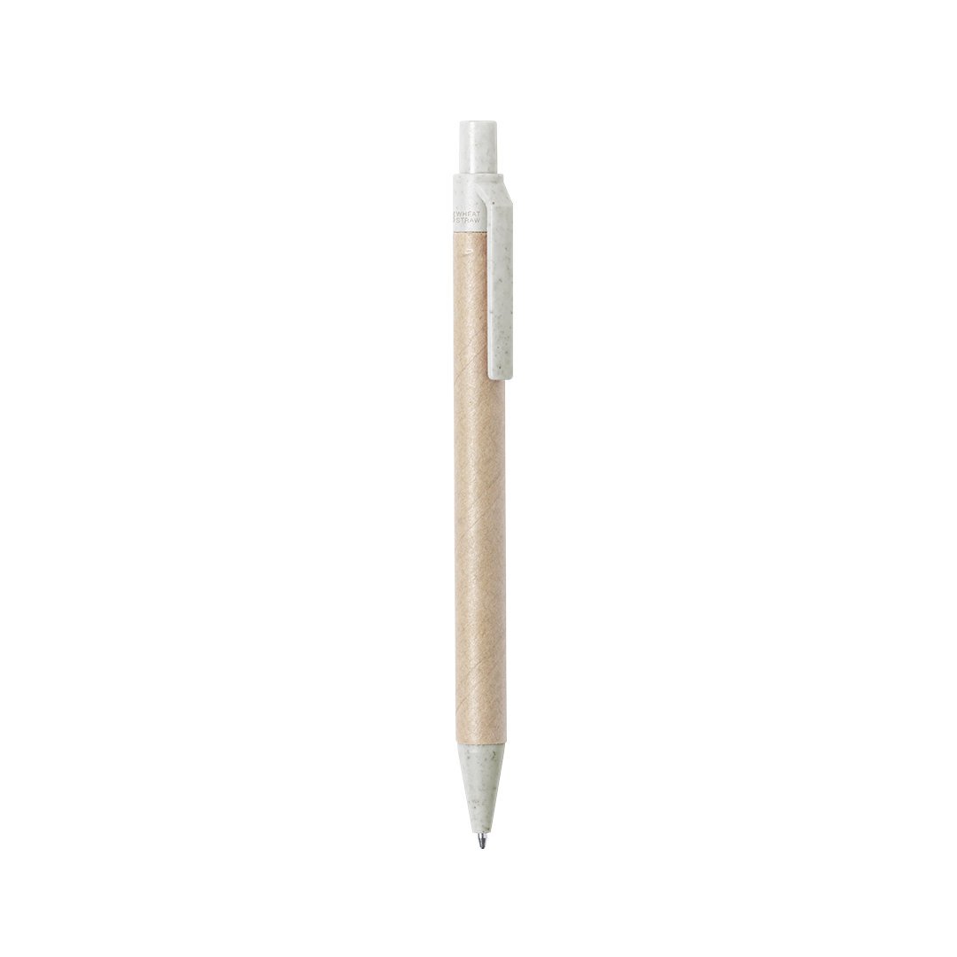 Bolígrafo de línea nature con mecanismo pulsador. Combinación de cuerpo en cartón reciclado de color natural y accesorios en caña de trigo y ABS , para así fomentar la utilización y reciclado de materias primas, reduciendo así las emisiones contaminantes.