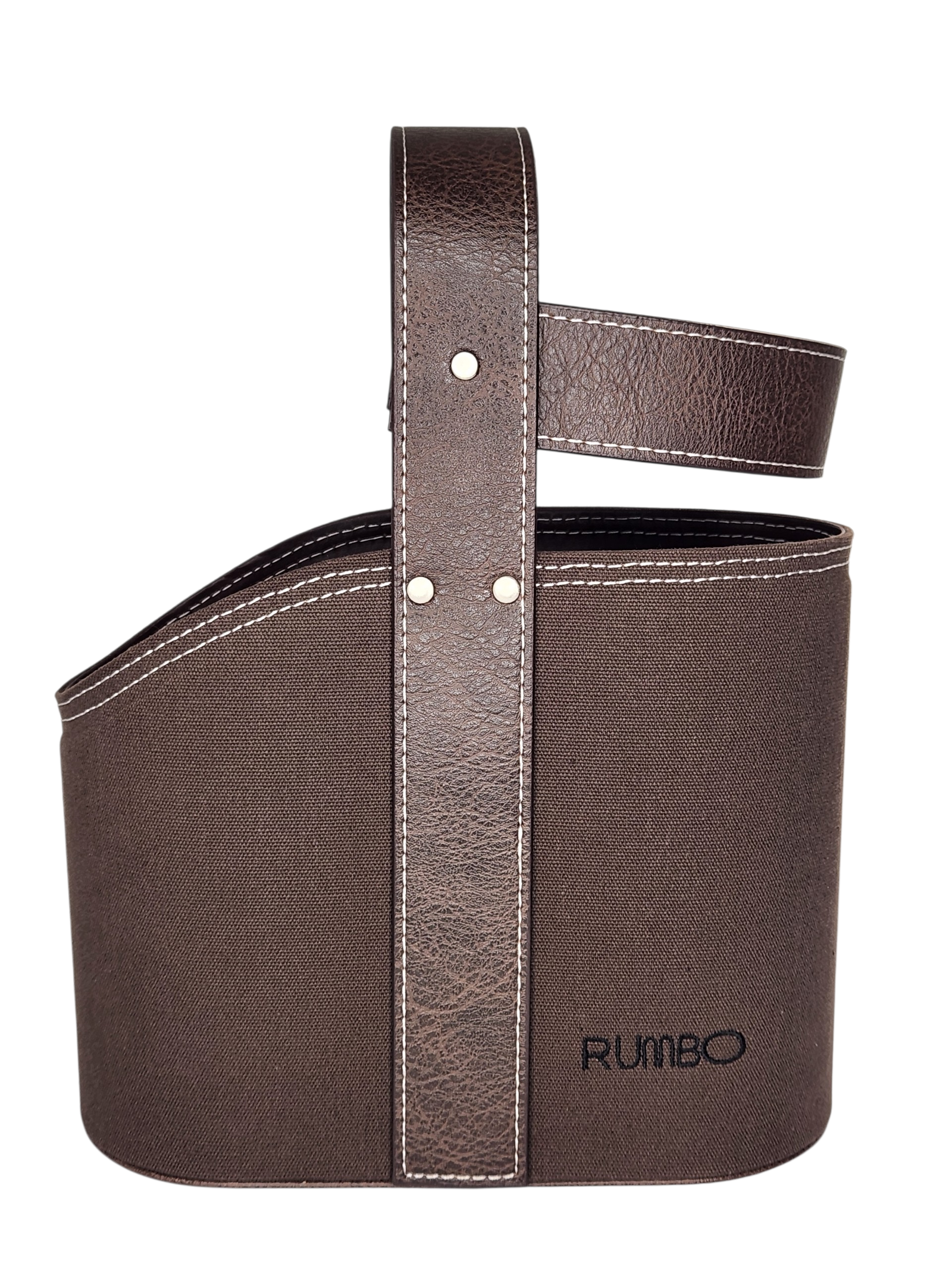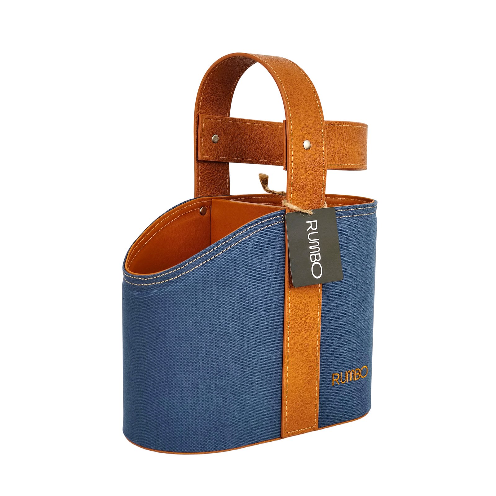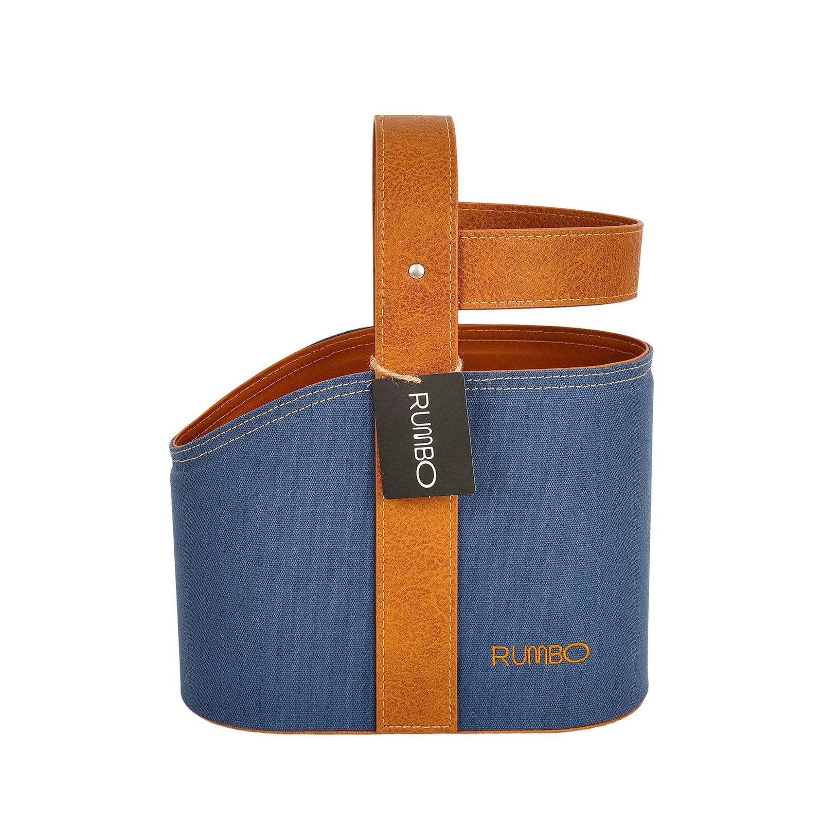 Bolso portamate marca RUMBO que combina un cuerpo de tela texturizada en azul profundo con detalles y asa en cuero color suela. Un diseño liviano, resistente y con un acabado rústico-moderno, ideal para acciones de merchandising y regalos corporativos que buscan un estilo joven y funcional.