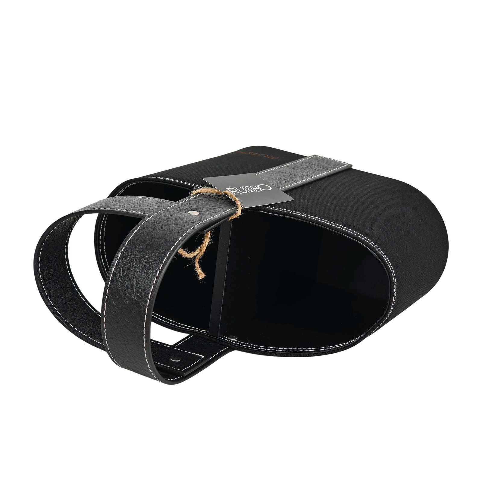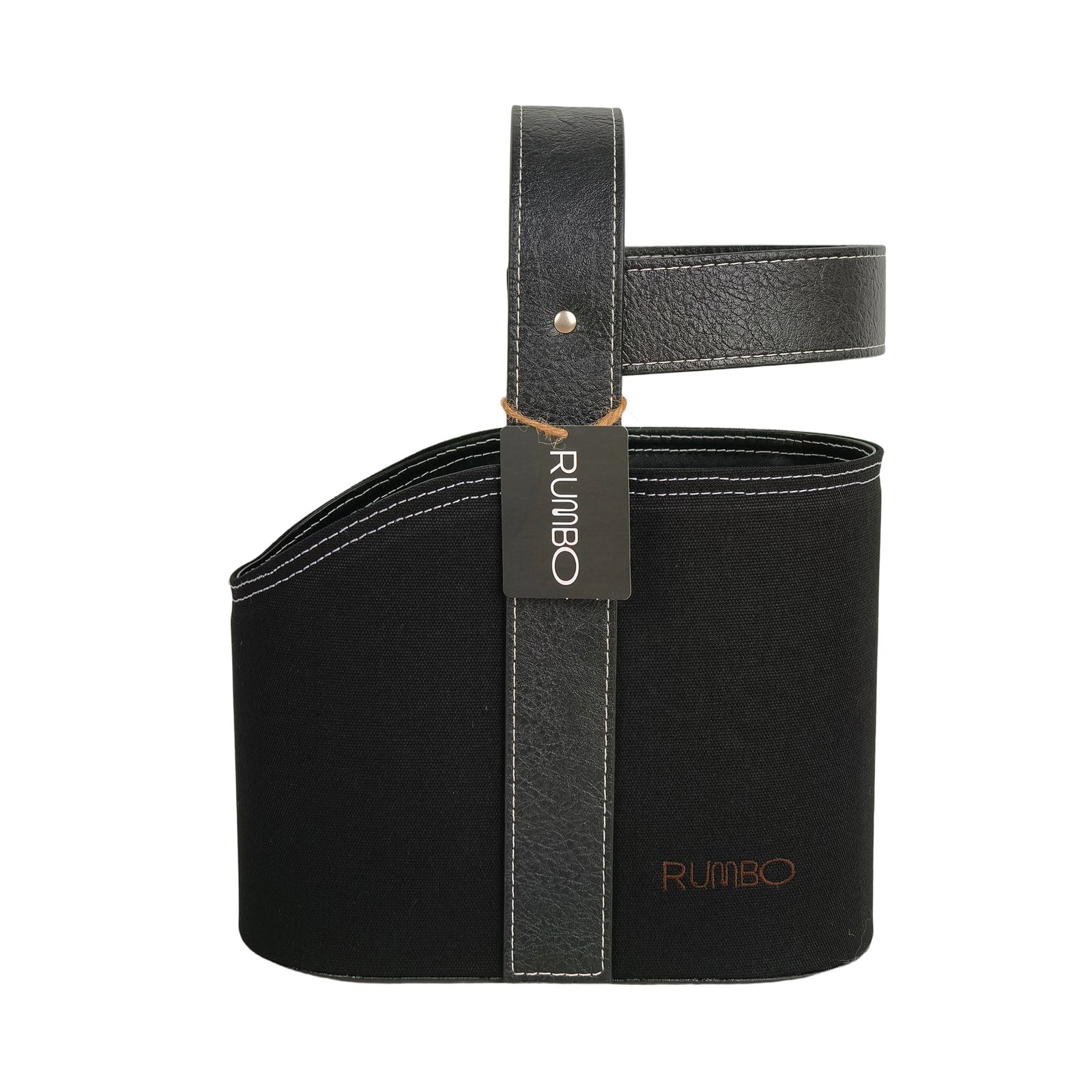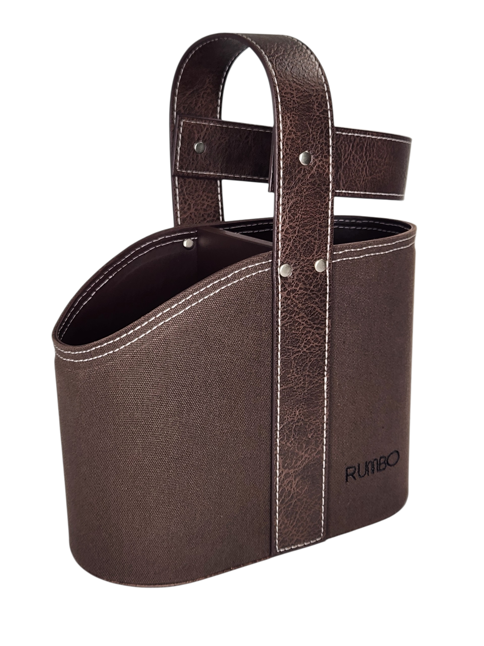 Bolso portamate marca RUMBO que combina un cuerpo de tela texturizada en azul profundo con detalles y asa en cuero color suela. Un diseño liviano, resistente y con un acabado rústico-moderno, ideal para acciones de merchandising y regalos corporativos que buscan un estilo joven y funcional.