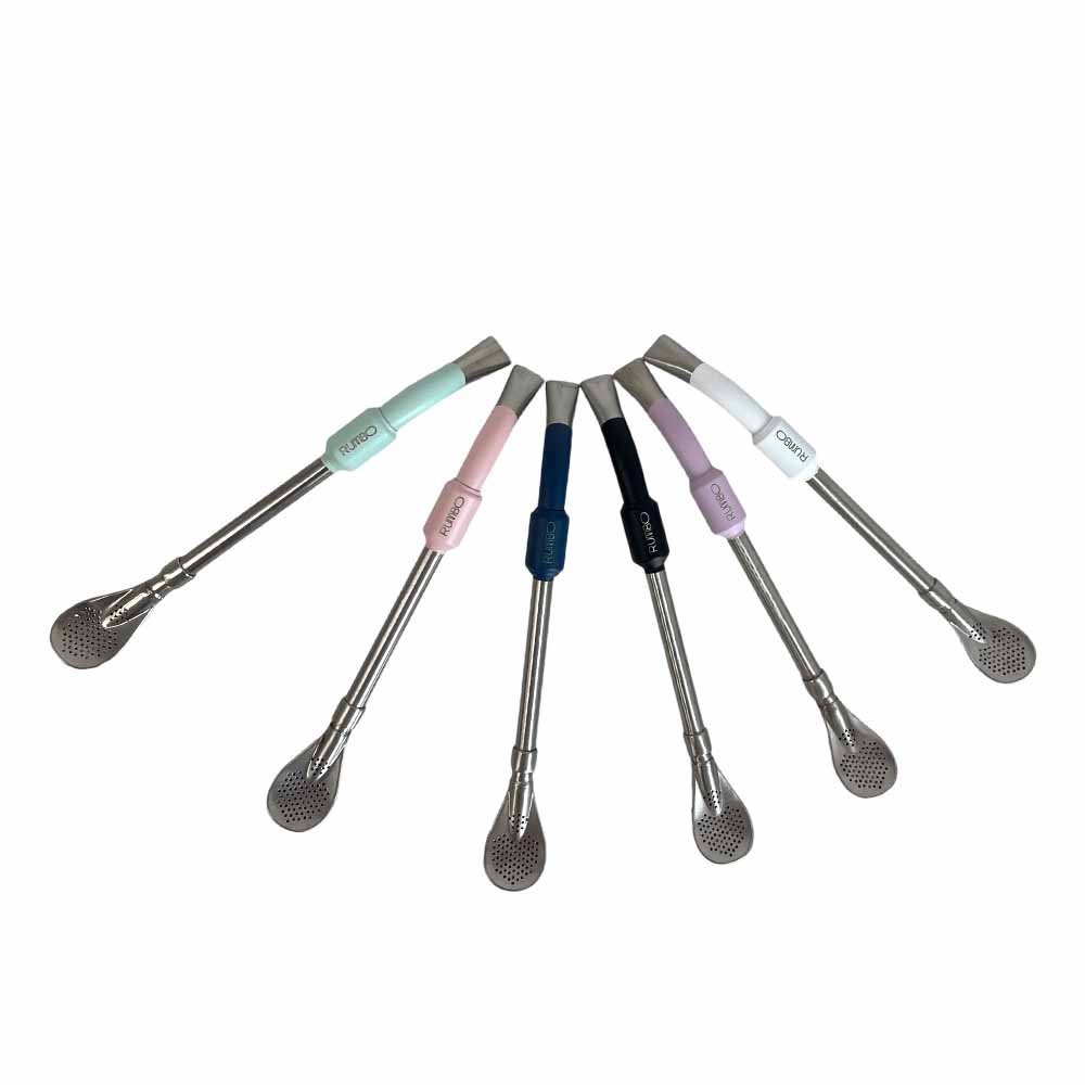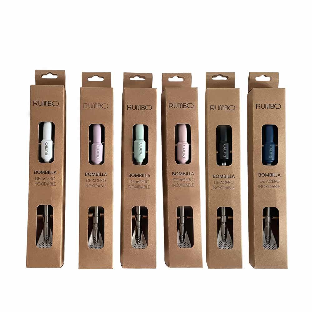 Bombilla premium marca RUMBO fabricada en acero inoxidable de alta calidad con aplique estético de polímero en diversos colores. Presentada en estuche individual de cartón kraft, es un accesorio higiénico, duradero y de diseño moderno, ideal para regalos corporativos masivos o lanzamientos de marca.