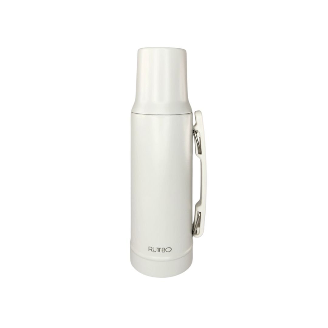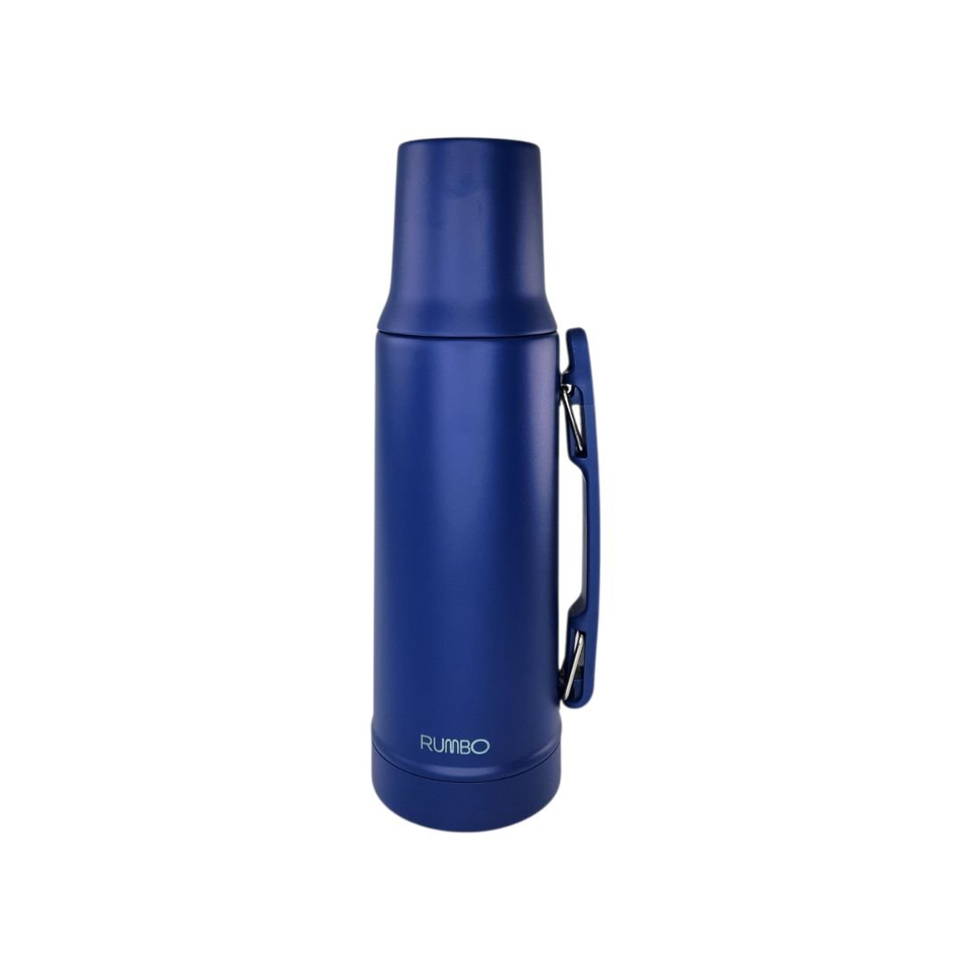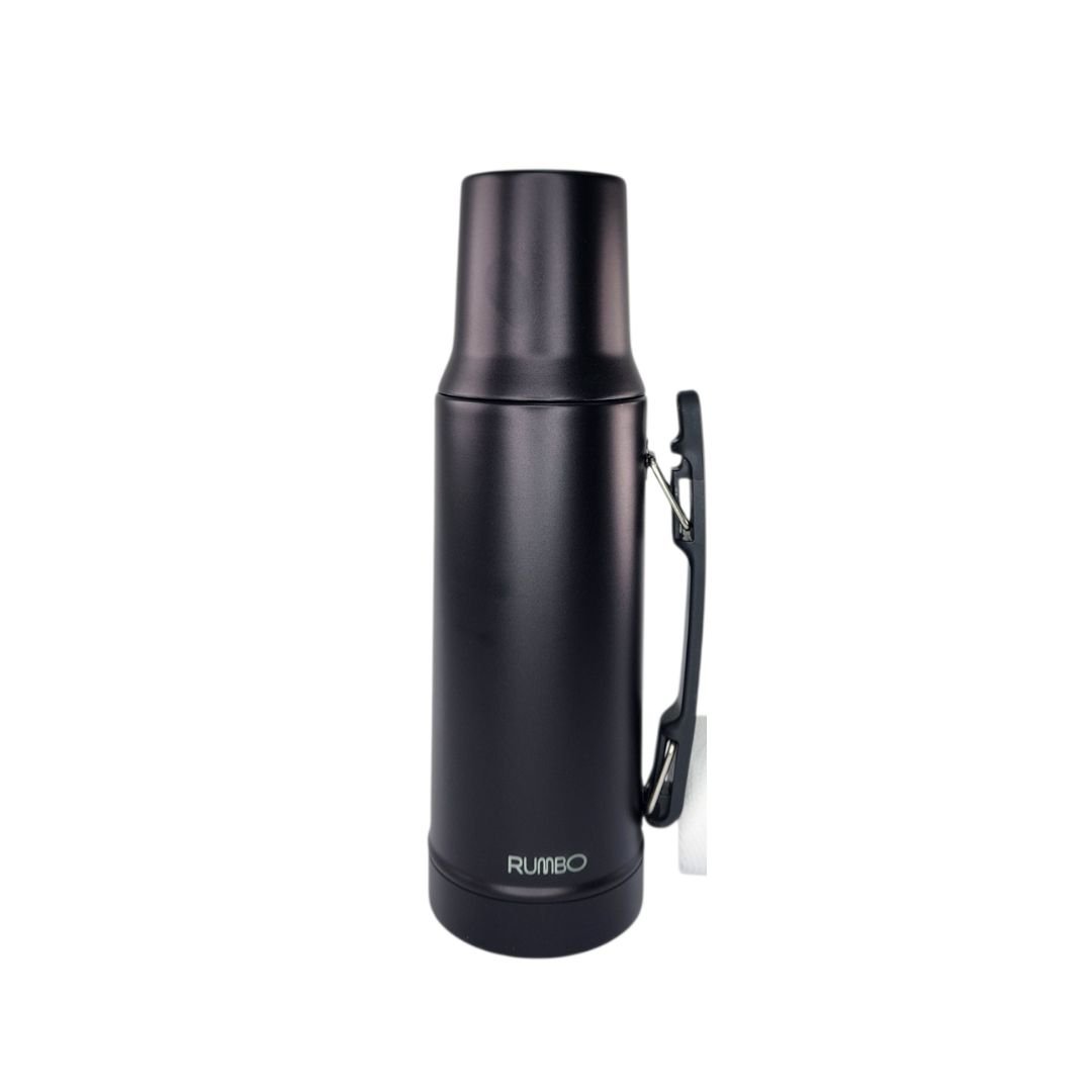 Termo premium marca RUMBO de 1 litro, fabricado en acero inoxidable de doble capa aislante. Cuenta con una robusta manija móvil lateral para un transporte cómodo y un tapón cebador de alta precisión. Máxima conservación de temperatura con un diseño resistente y profesional en acabado Black Matte.