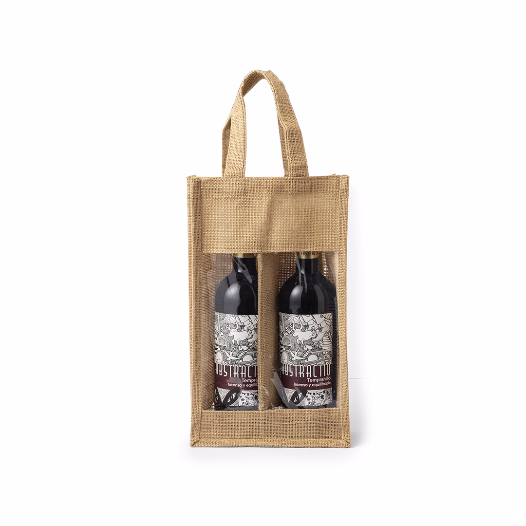 Resistente bolsa de yute laminado con compartimento individual para 2 botellas de vino de 75 cl. Con ventana transparente, ribetes y asas reforzadas.